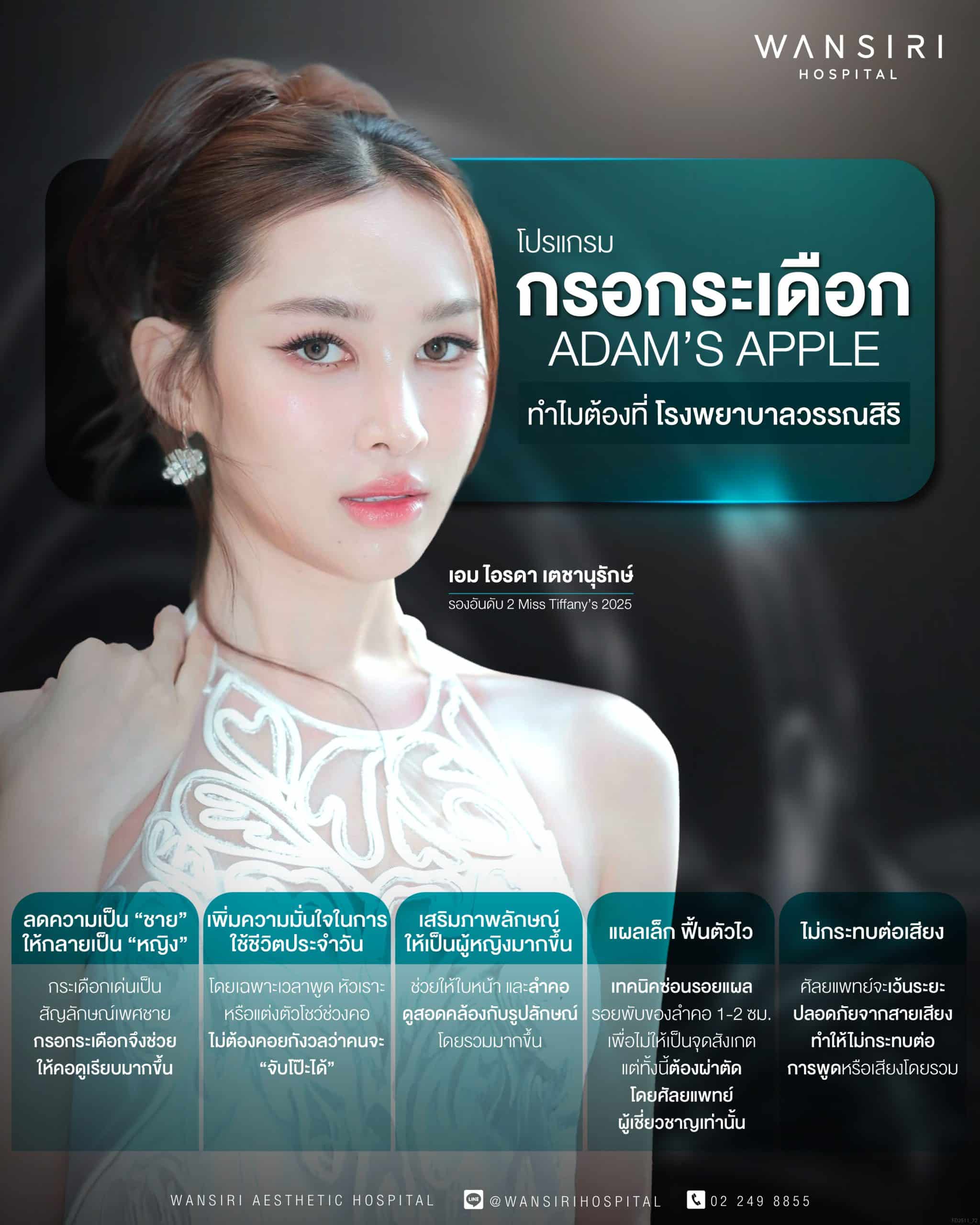 สวัสดีค่ะทุกคน เอมไอรดา เตชานุรักษ์ รองอันดับ 2 Miss Tiffany’s Universe 2025 นะคะ ตื่นเต้นมากค่ะ เพราะหลังจากที่เอมได้มา กรอกระเดือก ที่โรงพยาบาลวรรณสิริไป ชีวิตก็แฮปปี้ขึ้นมากๆ หลายๆครั้งนะคะเอมจะใช้การหลบมุมในการถ่ายรูป ไม่ว่าจะก้ม หรือจะเงยหน้า ก็ไม่ค่อยมีความมั่นใจมากเท่าไหร่ “ปัญหาก็เพราะลูกกระเดือกใหญ่นี่แหละค่ะ” ที่ทำให้เอมตัดสินใจมาแก้ปัญหานี้ที่โรงพยาบาลวรรณสิริ