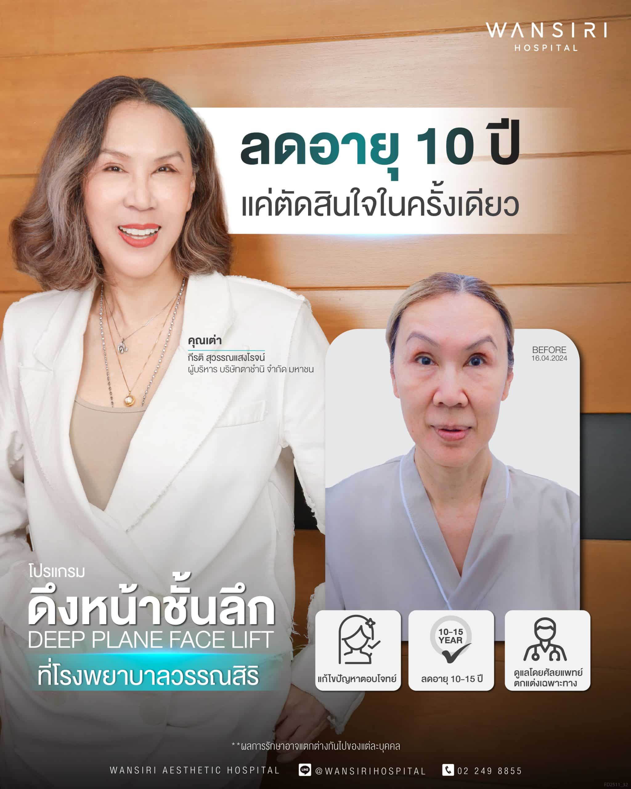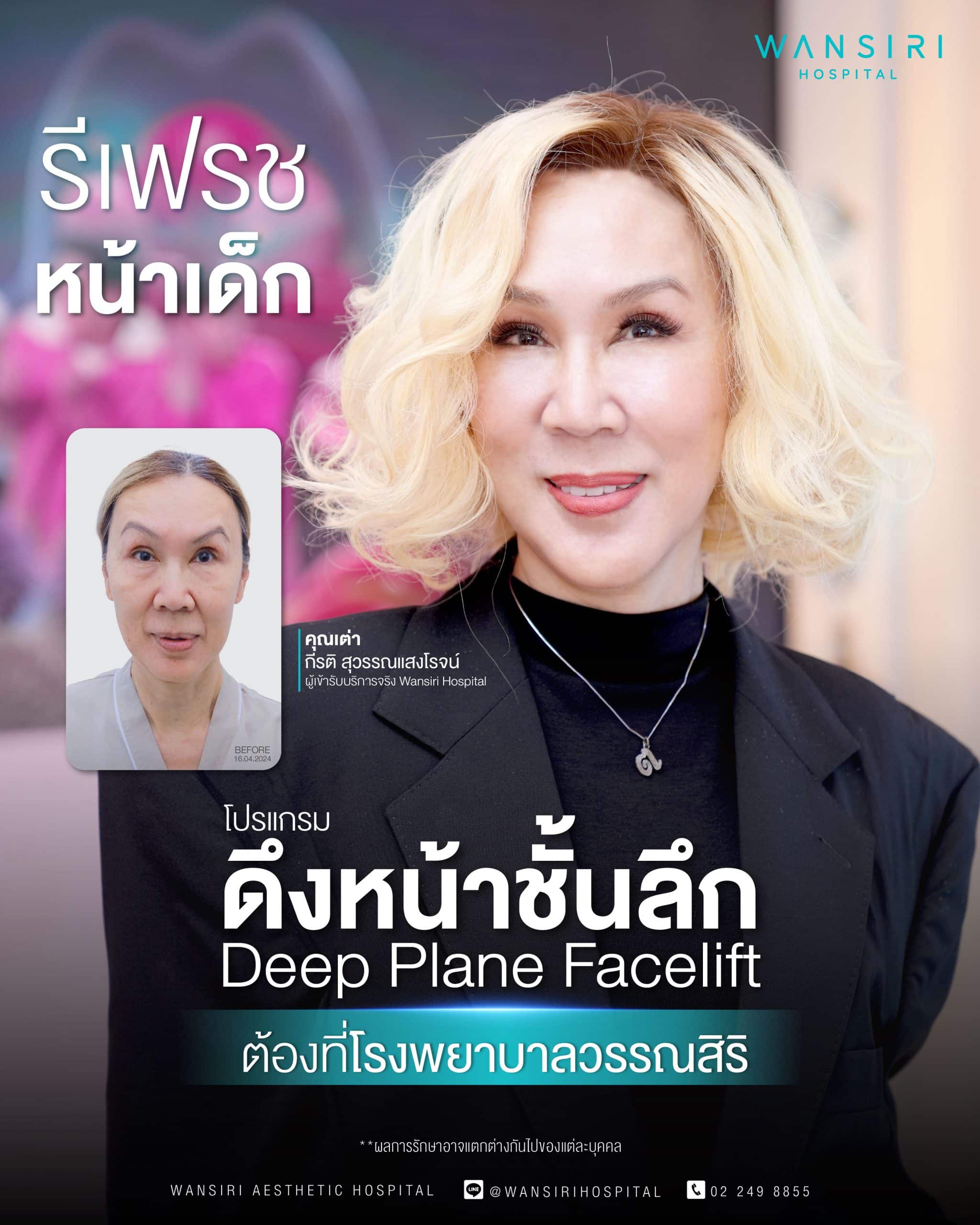ใครกว่าการทำศัลยกรรมดึงหน้า จะต้องดึงจนหน้าตึง และดูแข็งตลอดไป เพราะปัจจุบันบอกได้เลยว่าเทคนิค และนวัตกรรมทางการแพทย์ได้มีการคิดค้น และถูกพัฒนาให้เข้ากับตัวของคนไข้เป็นอย่างมาก เช่นเดียวกับการทำ ศัลยกรรมดึงหน้า ( Face Lift ) ที่ศัลยแพทย์ตกแต่งเฉพาะทางนั้นได้มีวิธี และแนวทางในการวางแผนการผ่าตัดแตกต่างกันออกไปในแต่ละบุคคล เนื่องจากปัญหาของแต่ละบุคคลไม่เหมือนกัน และอีกหนึ่งเคสที่โรงพยาบาลวรรณสิริอยากให้ทุกคนได้ทราบกันวันนี้ นั่นก็คือ คุณเต่า กีรติ สุวรรณแสงโรจน์ ผู้บริหารบริษัท ตาชำนิ จำกัด (มหาชน) ที่จะพาทุกคนมาตอกย้ำความมั่นใจว่าเป็นเพราะอะไร ทำไมคุณเต่านั้นถึงได้เลือกตัดสินใจทำศัลยกรรมดึงหน้าที่โรงพยาบาลวรรณสิริ