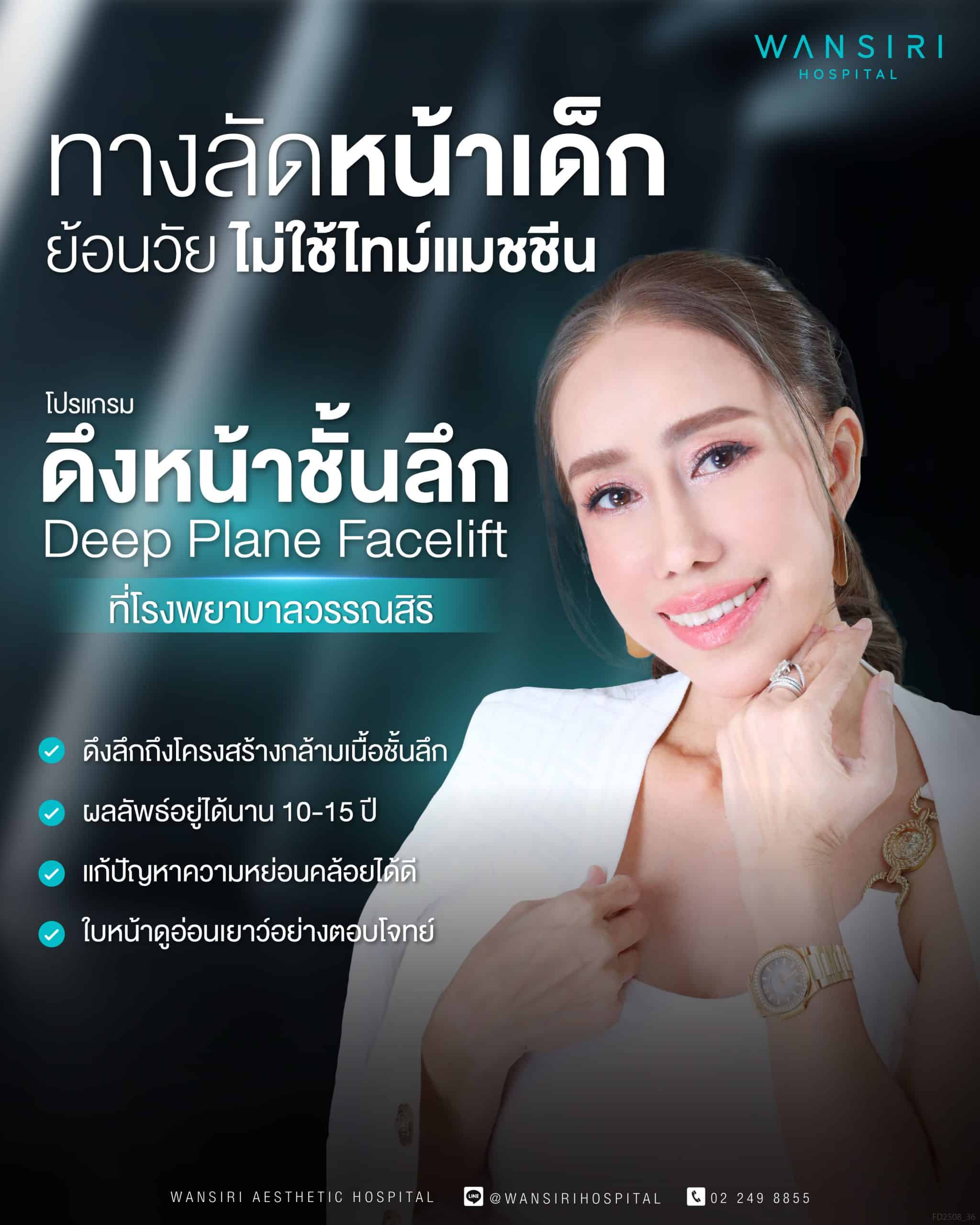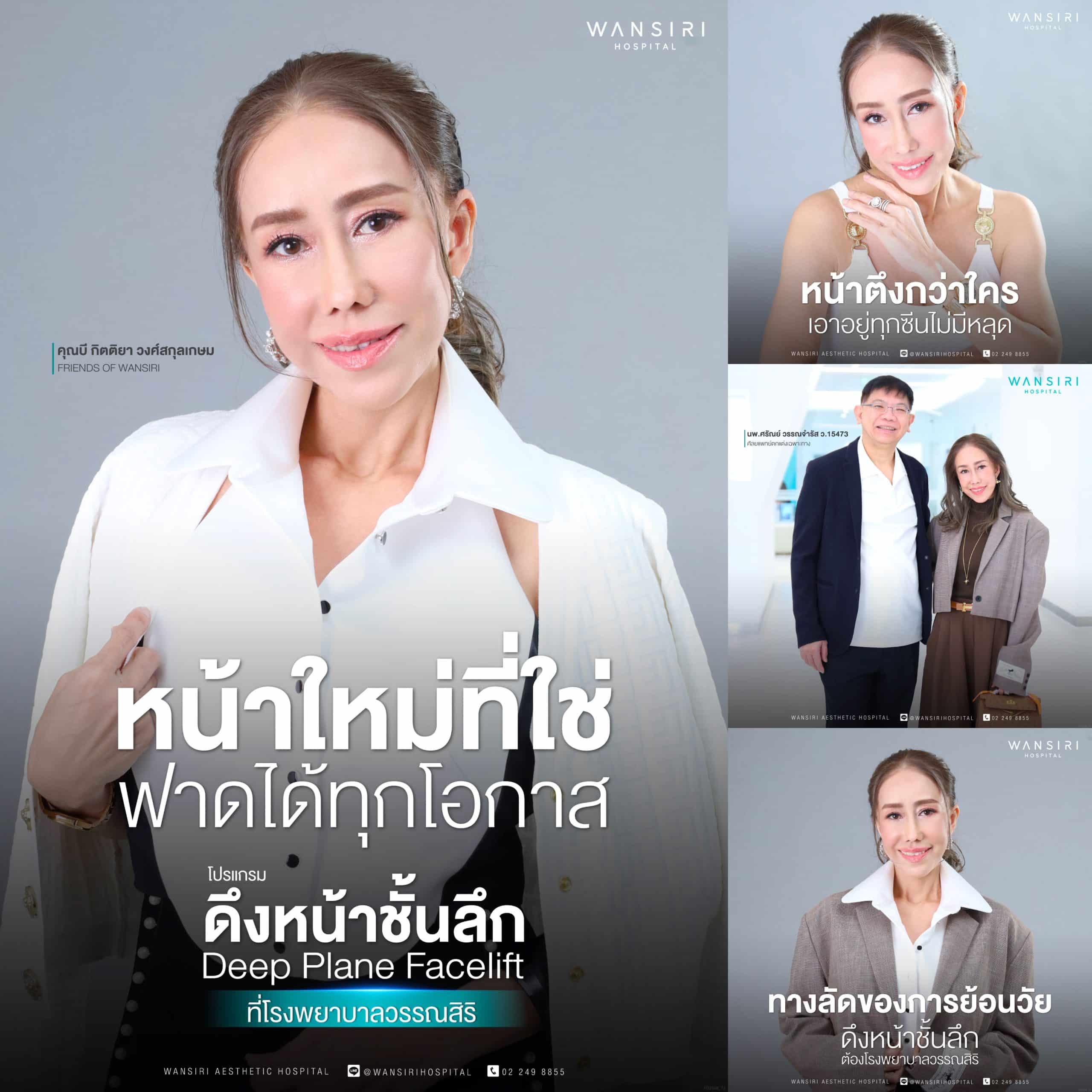 หากพูดถึงศัลยกรรมดึงหน้า โดยส่วนใหญ่แล้วคนไทยอาจจะคิดว่าดึงแล้วจะเปลี่ยนไปคนละคนจนดูปลอม แต่ที่โรงพยาบาลวรรณสิริไม่ใช่แบบนั้นแน่นอนค่ะ เพราะนอกจากเทคนิคที่ช่วยปลดล็อคชั้นกล้ามเนื้ออย่างการ ดึงหน้าชั้นลึก Deep Plane Facelift แล้ว ศัลยแพทย์ตกแต่งเฉพาะทางด้านการดึงหน้าโดยตรงของเรายังช่วยออกแบบรูปหน้าให้เหมาะสมกับแต่ละบุคคลอย่างตอบโจทย์มากที่สุด อีกทั้งนวัตกรรมยังล้ำสมัย ทำให้ผู้เข้ารับบริการทุกคนมั่นใจได้เลยว่าผลลัพธ์หลังการทำศัลยกรรมดึงหน้าที่โรงพยาบาลวรรณสิริ จะมั่นใจและปลอดภัยต่อตัวของคุณเองอย่างแน่นอน ซึ่งอีกหนึ่งเคสที่เราอยากจะมายกตัวอย่างให้กับทุกคนได้ทราบกันอย่างทั่วถึงกันในวันนี้ นั่นก็คือ “คุณบี กิตติยา วงศ์สกุลเกษม” Friends Of Wansiri ที่จะมาตอกย้ำความมั่นใจ และอัปเดตหลังจากดึงหน้าที่โรงพยาบาลวรรณสิริ ให้กับคนที่กำลังหาข้อมูลอยู่มั่นใจว่า ดึงหน้าที่โรงพยาบาลวรรณสิริ จะปลอดภัย และผลลัพธ์ที่ได้จะพึงพอใจอย่างแน่นอนค่ะ