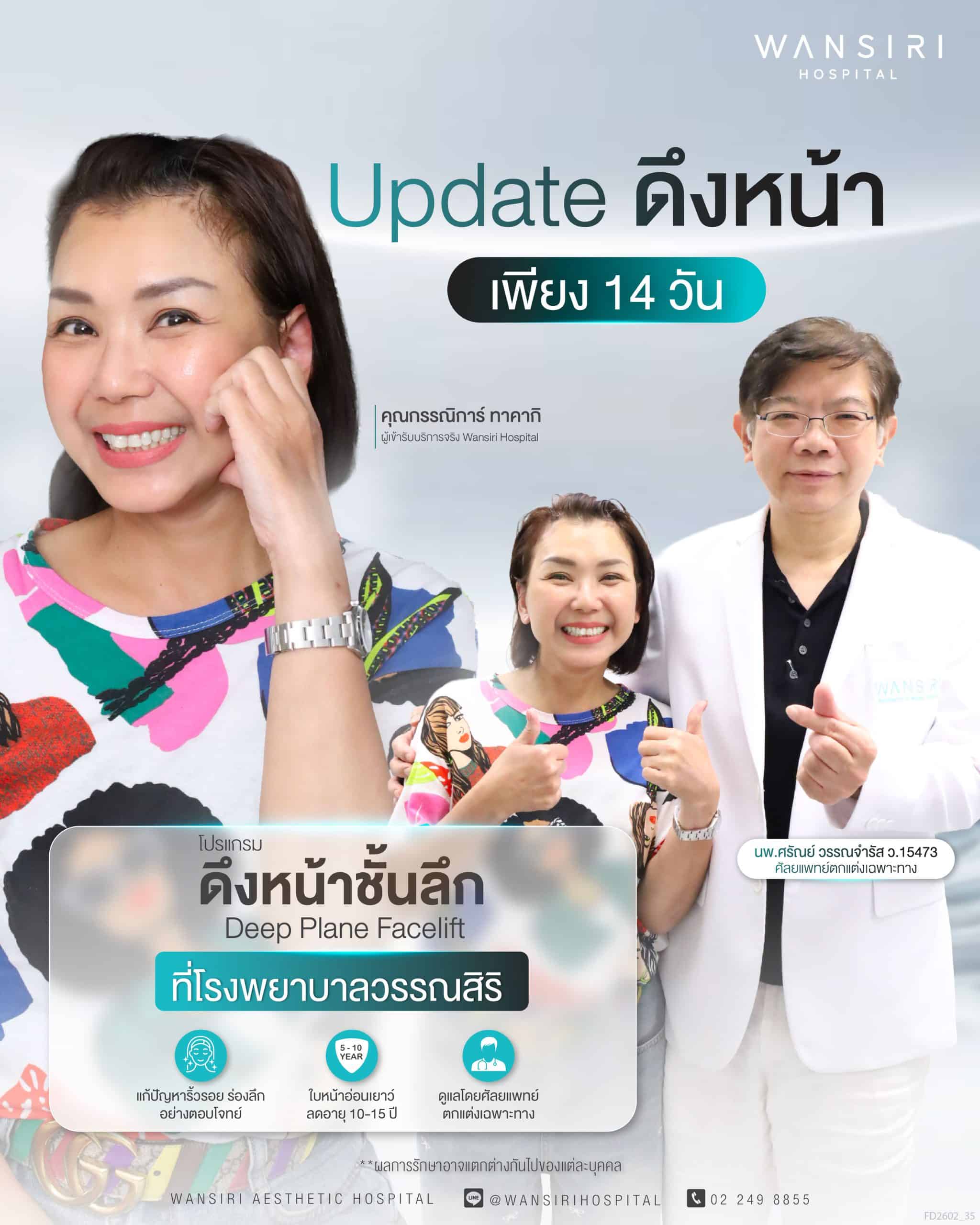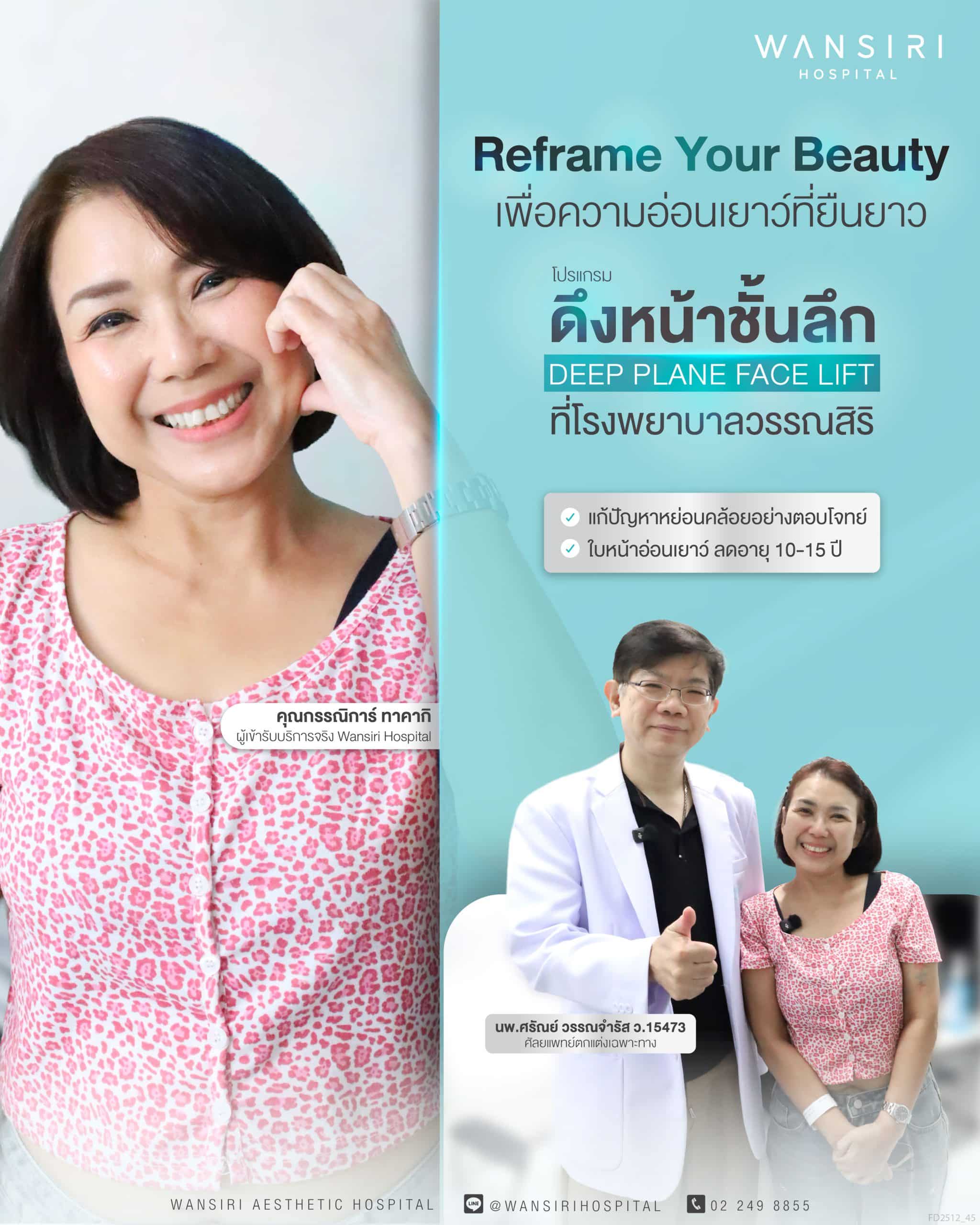 เมื่ออายุเพิ่มขึ้น ความหย่อนคล้อยของใบหน้าไม่ได้เกิดขึ้นเฉพาะที่ผิวหนัง แต่เกิดจากการเปลี่ยนแปลงของโครงสร้างชั้นลึก ไม่ว่าจะเป็นชั้นกล้ามเนื้อ เนื้อเยื่อ และแรงพยุงของใบหน้า การศัลยกรรมดึงหน้าชั้นลึก Deep Plane Facelift จึงถูกพัฒนาขึ้นเพื่อแก้ไขปัญหาเหล่านี้อย่างตรงจุด โดยไม่เน้นการดึงผิวให้ตึงเพียงภายนอก การดึงหน้าชั้นลึกเป็นเทคนิคการผ่าตัดที่ยกทั้งผิวหนังและโครงสร้างในชั้น Deep Plane ขึ้นพร้อมกัน ช่วยฟื้นฟูตำแหน่งของแก้ม กรอบหน้า และร่องลึกให้กลับมาใกล้เคียงกับช่วงวัยที่อ่อนเยาว์ ผลลัพธ์ที่ได้จึงดูเป็นธรรมชาติ ใบหน้าไม่แข็งตึง และคงอยู่ได้ยาวนานกว่าวิธีการดึงหน้าแบบทั่วไป และในวันนี้เราจะพาทุกคนไปพบกับผู้เข้ารับบริการจริง “คุณกรรณิการ์ ทาคากิ” ที่จะมาแชร์เรื่องราวดีๆ เกี่ยวกับศัลยกรมดึงหน้าชั้นลึก Deep Plane Facelift ที่โรงพยาบาลวรรณสิริ ให้กับทุกคนได้ทราบกันในวันนี้ ถ้าอยากรู้แล้วว่าเป็นอย่างไร เชิญรับฟังเรื่องราวต่อจากนี้ไปพร้อมๆ กันได้เลยค่ะ
